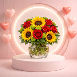 Price: $69.99Sunrise Blush Delight – Sunflowers & Pink Roses